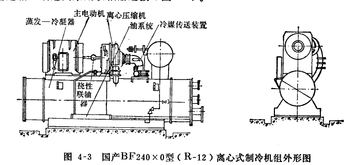 主電動機外裝式,是指機組中的離心式制冷壓縮機與增速箱裝在周一機殼內(nèi),主電動機與增速箱一端之聞采用聯(lián)軸器連接(圖4-3)。