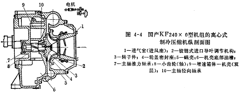 單級壓縮式是將單級離心式制冷壓縮機、增速裝置、主電動機裝在所聯(lián)接的封閉殼體之內(nèi)(圖4-4)。