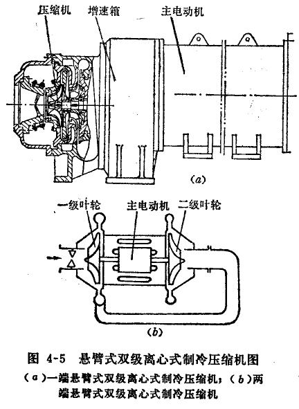 雙級壓縮式包括一端懸臂式(圖4-5a)、兩端懸臂式(圖4-5b)和兩端支掉式(圖4-6)。前者采用較多,增速箱根據(jù)需要有或無。