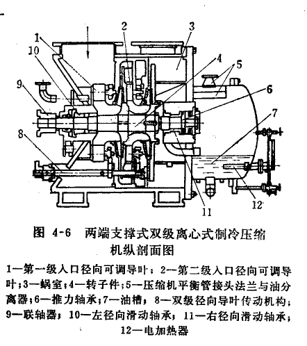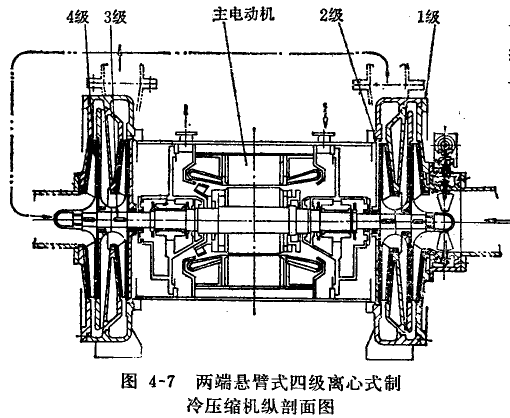 兩端懸臂式無增速裝置,兩級葉輪分別掛在主電動機軸兩端,兩級間有管路相通。由于壓縮機與主電動機轉(zhuǎn)速同步,轉(zhuǎn)速較低。圖4-7為兩蠟懸臂式四級離心式制冷壓縮機縱剖面圖。