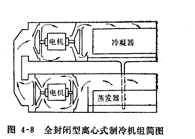 指整個制冷機組封閉在同一殼體內(nèi)。一般用于小型空調(diào)用離心式制冷機組,優(yōu)點是氣密性好,取消增速裝置因而結(jié)構(gòu)簡單,噪聲低,振動小,外觀單一(見圖4-8)。