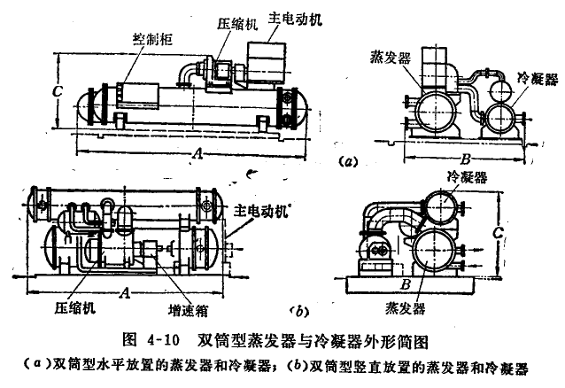 當(dāng)機組制冷量太小時,出于工藝制造上的困難,常做成雙筒型。蒸發(fā)器和冷凝器各一個筒體,采取上下或橫排安裝方式。目前空調(diào)用機組上,國外仍有廠家采用。但在相互有絕熱要求的低溫離心式制冷機組中廣泛使用。
