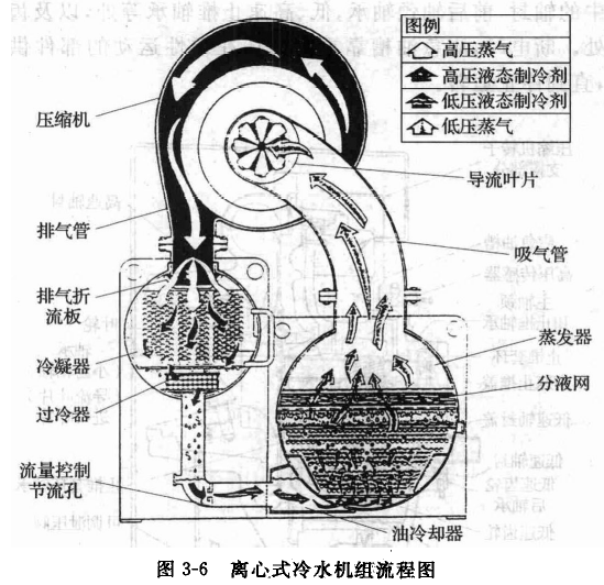 液體制冷劑經過節(jié)流孔板進入蒸發(fā)器下部的分液槽,并經過滿布小孔的分液板,均勻迸液,吸收冷凍水的熱量汽化,氣體離開蒸發(fā)器前,分液網將它夾帶的液滴分離,然后進入離心式制冷壓縮機,壓縮后的氣體進入冷凝器,在冷凝器中冷卻、冷凝,并過冷。其系統(tǒng)流程圖如圖3-6所示。