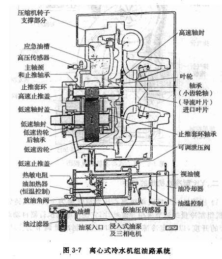 2)壓縮機的潤滑系統(tǒng)(見圖3-7) 它由油泵、油過濾器、油冷卻器和油璐等組成。油泵為浸入式放在油槽內,按下壓縮機啟動開關,油泵立刻啟動,延時50s,待油壓穩(wěn)定后,壓縮機才啟動。在壓縮機運行中或停機減速的150s中,油泵都在工作,潤滑油被油泵吸入后,被排至油冷卻器冷卻,經濾油器,迸入應急油槽(高位油箱),然后被分到需要潤滑的部位,如低、高速驅動軸中的軸封,前后軸頸軸承,低、高速止推軸承等處,以及齒輪嚙合處。斷電時,應急油槽靠重方向還在慣性運動的部件供油潤滑,直到停止運轉。