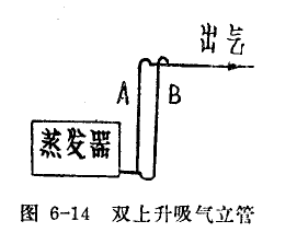 圖6-14為雙上升吸氣立管布置圖。其中A管為小口徑管道,它應(yīng)保證最低負(fù)荷時(shí)能夠攜帶潤滑油。A和B兩根立管同時(shí)工作,保證滿負(fù)荷運(yùn)行,此時(shí),全部吸氣管的壓力損失應(yīng)不超過希望的限度,同時(shí)又能保證帶油。在變負(fù)荷情況下運(yùn)行,兩個(gè)立管同時(shí)工作,氣流速度不足以帶油上升時(shí),B管下部的油封將逐漸被充滿,直至B管被隔斷,僅靠A管工作。為了避免單管工作時(shí),可能有潤滑油不斷地進(jìn)入未工作的立管,兩管均應(yīng)從上部與水平管相接。