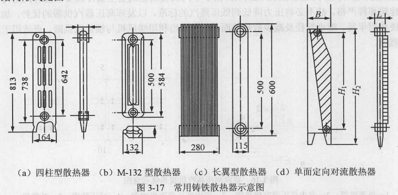 鑄鐵散熱器具有結(jié)構(gòu)簡單、防腐、使用壽命長及熱穩(wěn)定性好等優(yōu)點(diǎn),但金屬耗量大,金屬熱強(qiáng)度低,運(yùn)輸、組裝工作量大,承壓能力低,不宜用于高層,而在多層建筑熱水及低壓蒸汽供暖工程中廣泛應(yīng)用。常用的鑄鐵散熱器有:四柱型、M-132型、長方翼型、圓翼型等,其結(jié)構(gòu)形式見圖3-17。