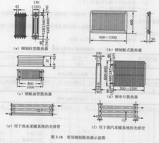 鋼制散熱器存在易被腐蝕、使用壽命短等缺點(diǎn),應(yīng)用范圍受到一定限制。但它具有制造工藝簡單、外形美觀、金屬耗量小、重量輕、運(yùn)輸、組裝工作量少、承壓能力高等特點(diǎn),可應(yīng)用于高層建筑供暖。鋼制散熱器的金屬強(qiáng)度比鑄鐵散熱器的高,除鋼制柱型散熱器外,鋼制散熱器的水容量較少,熱穩(wěn)定性較差,耐腐蝕性差,對供暖熱媒水質(zhì)要求高,非供暖期仍應(yīng)充滿水,而且不適于蒸汽供暖系統(tǒng)。常用的鋼制散熱器有:柱式、板式、扁管型、串片式、光排管式等,如圖3-18所示。