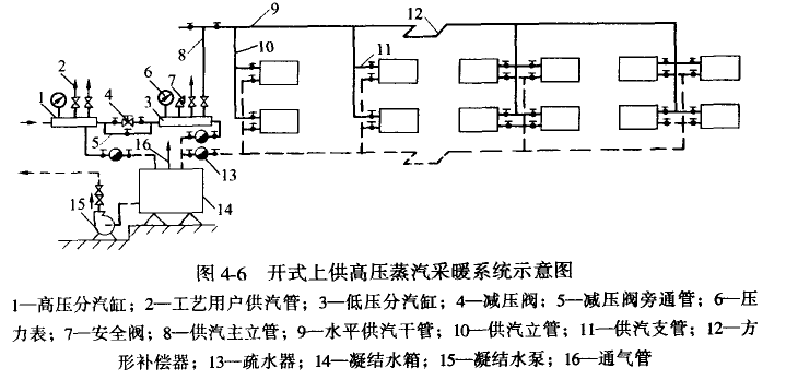 圖4-6為開式上供高壓蒸汽采暖系統(tǒng)的示意圖。由鍋爐房將蒸汽輸送到熱用戶。首先進入高壓分汽缸1,將高壓蒸汽分配給工藝生產用汽。高壓分汽缸上可分出多個分支,向有不同壓力要求的工藝用汽設備供汽。蒸汽經減壓閥4減壓后進入低壓分汽缸3。減壓閥設有旁通管5,供修理減壓閥時旁通蒸汽用。安全閥7限制進入采暖系統(tǒng)的最高壓力不超過額定值。從低壓分汽缸3上還可以分出許多供汽管,分別供通風空調系統(tǒng)的蒸汽加濕、汽水換熱器以及蒸汽加熱器和用蒸汽的暖風機等用汽設備。系統(tǒng)中設有疏水器13,將沿途以及系統(tǒng)產生的凝結水排到凝結水箱14中,凝結水箱上有通氣管16通大氣、排除箱內的空氣和二次蒸汽,也因此稱為開式系統(tǒng)。凝結水箱中的水由凝結水泵15送回凝結水泵站或熱源。
