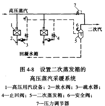當工業(yè)廠房中用汽設備較多,用汽量大時,凝結水系統(tǒng)產生的二次蒸汽量大,還可以利用二次蒸。發(fā)箱將二次汽匯集起來加以利用。圖4-8是設置二次蒸發(fā)箱的高壓蒸汽采暖系統(tǒng)。高壓用汽設備1的凝結水通過疏水器3進入二次蒸發(fā)箱5。二次蒸發(fā)箱設置在車間內3m左右高度處。蒸汽在二次蒸發(fā)箱內擴容后產生的二次汽可加以利用。當二次汽量較小時,由高壓蒸汽供汽管補充??繅毫φ{節(jié)器7控制補汽量,以保持箱內壓力20-40kPa(表壓力),并滿足二次蒸汽熱用戶的用汽量要求。當二次蒸發(fā)箱內二次汽量超過二次蒸汽熱用戶的用汽量時,二次蒸發(fā)箱內壓力增高,箱上安裝的安全閥6開啟,排汽降壓。