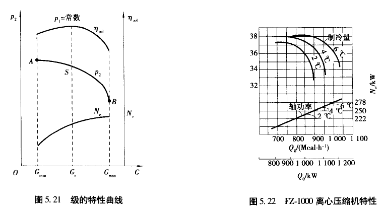 如圖5.21所示,S點為設(shè)計點,所對應(yīng)的工況為設(shè)計工況。由流量-效率曲線可見,在設(shè)計工況附近,級的效率較高;偏離越遠,效率降低越多。圖中的流量-排出壓力曲線表達了級的出口壓力與輸氣量之間的關(guān)系。B點為該進口壓力下的最大流量點。當流量達到這一數(shù)值時,葉輪中葉片進口截面上的氣流速度將接近或到達聲速,流動損失很大,氣體所得到的能量頭用以克服這些阻力損失,流量不可能再增加,通常將此點稱為滯止工況。圖中A點為喘振點,其對應(yīng)的工況為喘振工況,此時的流量為進口壓力下級的最小流量,當流量低于這一數(shù)值時,由于供氣量減少,而制冷劑通過葉輪流道的損失增大到一定的程度,有效能量頭將不斷下降,使得葉輪不能正常排氣致使排氣壓力陡然下降。這樣,葉輪以后的高壓部位的氣體將倒流回來。當?shù)沽鞯臍怏w補充了葉輪中的氣量時,葉輪又開始工作,將氣體排出。爾后供氣量仍然不足,排氣壓力又會下降,又出現(xiàn)倒流,這樣劇期性重復(fù)進行,使壓縮機產(chǎn)生劇烈的振動和噪聲而不能正常工作,這種現(xiàn)象稱為喘振現(xiàn)象。因此,運轉(zhuǎn)過程中應(yīng)極力避免喘振的發(fā)生。喘振工況A和滯止工況B之間即為級的穩(wěn)定工作范圍。性能良好的壓縮機級應(yīng)有較寬的穩(wěn)定工作范圍。