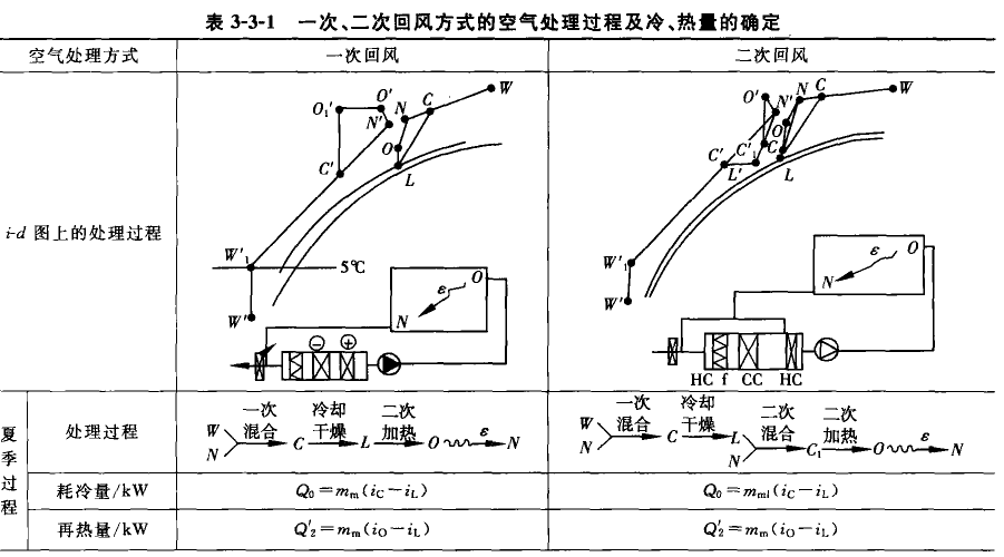1.普通集中式空調(diào)系統(tǒng)就是低速、單風(fēng)道集中式空調(diào)系統(tǒng),也是典型的全空氣系統(tǒng)。最常用的是混合式系統(tǒng),即處理的空氣是新鮮空氣和室內(nèi)回風(fēng)的混合,按回風(fēng)情況不同分為一次回風(fēng)系統(tǒng)和二次回風(fēng)系統(tǒng)。一次或二次回風(fēng)方式的冬、夏季空氣處理過程和所需冷、熱容量的確定方法見表3-3-1。