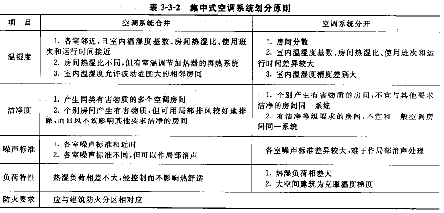 根據(jù)集中空調(diào)系統(tǒng)所服務(wù)建筑物的使用要求和特點(diǎn),可按表3-3-2所列原則進(jìn)行劃分。