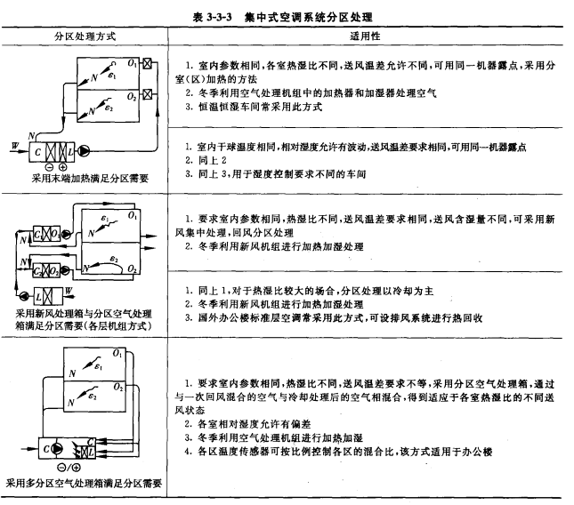 雖然在系統(tǒng)劃分時(shí),盡可能把室內(nèi)參數(shù)、熱濕比等相近的房間組合成一個(gè)系統(tǒng),但仍不可避免有要求和條件不甚相同的房間需要組成共同的系統(tǒng),以減少投資和運(yùn)行費(fèi)用。分區(qū)處理的特征和適用性見表3-3-3。這時(shí)可以用集中處理新風(fēng)和相對(duì)集中分區(qū)處理送風(fēng)的方法來滿足實(shí)際需要。