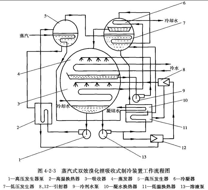 如圖4-2-3所示為較為常見的蒸汽雙效型溴化鋰吸收式制冷裝置工作流程。它由冷凝器、高壓發(fā)生器、低壓發(fā)生器、蒸發(fā)器、吸收器、高溫換熱器、低溫換熱器、凝水換熱器、泵、引射器等設備組成。高壓發(fā)生器由一只單獨的高壓筒組成,低壓發(fā)生器j冷凝器和蒸發(fā)器、吸收器分置于另外兩只筒體內。裝置為并聯(lián)流程,吸收器3出口的稀溶液由溶液泵13輸出并分為兩路:一路經高溫換熱器2升溫后,進入高壓發(fā)生器5;另一路經低溫換熱器11及凝水換熱器10升溫后,進入低壓發(fā)生器7。高壓發(fā)生器中的壓力一般為低壓發(fā)生器壓力的10倍,進入高壓發(fā)生器中的稀溶液被管內的工作蒸汽加熱,產生壓力與溫度較高的冷劑蒸汽,溶液的溫度與質量分數升高。低壓發(fā)生器中,稀溶液被來自高壓發(fā)生器的冷劑蒸汽加熱,再次產生冷劑蒸汽,溶液的溫度與溴化鋰的質量分數升高。