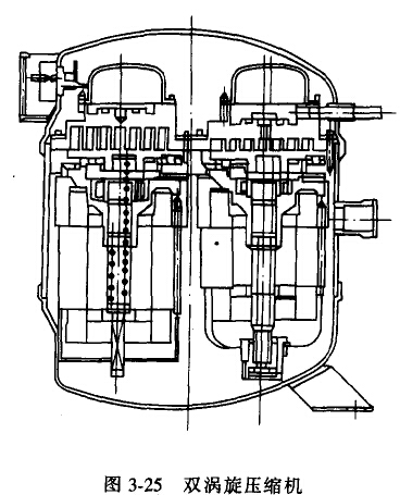 如圖3-25所示,雙渦旋壓縮機將兩個渦旋壓縮機封裝在同一鋼殼內(nèi),一個壓縮機為定轉(zhuǎn)速壓縮機,而另一個為變轉(zhuǎn)速壓縮機。此類壓縮 機可裝較多潤滑油和制冷劑,可保證壓縮機在多聯(lián)室內(nèi)機組時有較可靠潤滑保證,并可實現(xiàn)無級調(diào)節(jié),且功率范圍較大。