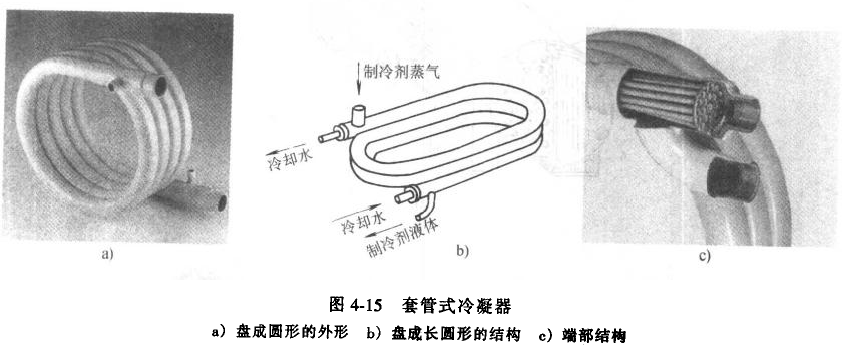 由圖4-15b可見,制冷劑蒸氣從上部進入套管的管間空腔,在內(nèi)管外表面上冷凝,冷凝液在蒸氣流速和自身重力作用下沿盤管往下流動,從套管下端流出,麗冷卻水在水泵作用下,從下部進入內(nèi)管內(nèi),由上部流出,因而是純逆流布置的。套管式冷凝器的盤管總長不宜太長。太長時,不僅傳熱管內(nèi)流體的流動阻力較大,更由于盤管下部會積聚較多的冷凝液,使冷凝傳熱管的面積不能充分利用。通常在空調(diào)冷量小于20kVV時,可銅成一只內(nèi)套三根或一根傳熱管的套管式冷凝器;而在空調(diào)冷量大于20kW的場合,可制成2-4個并聯(lián)使用的套管式冷凝器,或者如圖4-15c所示用稍大直徑外管內(nèi)套20余根傳熱管,以減少或避免盤管下部的積液問題。