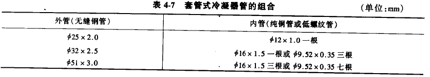 由無縫鋼管作外管,由一根或三根以上純銅傳熱管作內(nèi)管穿入其中后,盤成圓形或長圓形的套管式冷凝器如圖4-15a、b所示。外管與內(nèi)管的組合尺寸見表4-7。更大的甚至有二十根左右的內(nèi)管見圖4-15c。