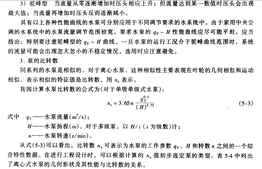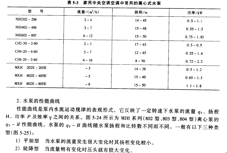 水泵型式的選擇與水系統(tǒng)的特點(diǎn)、安裝條件、運(yùn)行調(diào)節(jié)要求和經(jīng)濟(jì)性等有關(guān)。家用中央空調(diào)系統(tǒng)要求水泵具有噪聲低、耐腐蝕和使用壽命長等特點(diǎn)。表5-3為家用中央空調(diào)的水系統(tǒng)中常用的離心式水泵。根據(jù)系統(tǒng)對流量和揚(yáng)程的不同要求,可以分別選用單級泵或多級離心泵。