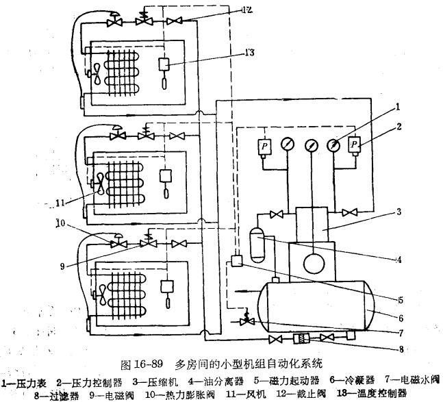 圖16-89所示的是用于三個房間的小型機組的自動化系統(tǒng),每個房間均裝有一個溫度控制器,當房間溫度升到調(diào)定值上限時,開啟本房間的電磁閥和風機,降到下限時關(guān)閉。三個溫度控制器均與壓縮機的磁力起動器連接,當三個房間的溫度都降到調(diào)定值下限時,壓縮機停止運轉(zhuǎn);而當其中一個房間的溫度上升到上限時,則電動機再次運轉(zhuǎn)。電磁水閥與壓縮機同步。機組裝有高壓與低壓控制器作為壓縮機安全保護。