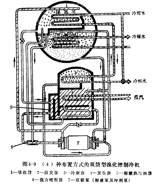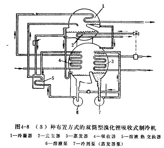 圖4-3所示的三筒型溴化鋰吸收式制冷機是一制冷量為35萬kcal/h (407.05kW)的機組。上而并列兩筒,分別為發(fā)生器與冷凝器,下筒內(nèi)置有蒸發(fā)器與吸收器。為了防止溴化鋰溶液液層因船舶傾斜、搖擺而進入冷凝器,發(fā)生器采用了噴淋式結(jié)構(gòu)。蒸發(fā)的冷荊蒸汽順著噴淋溶液方向通向垂直通道,經(jīng)擋液板及橋管進入冷凝器。汽流在向上流動的過程中,由于重力作用進一步分離液滴。擋液作用進一步分離液滴。擋液板做成單折或雙折人字形,安裝在垂直通道中,以取得更好的擋液效果。蒸發(fā)器擋液板則排列在蒸發(fā)器噴淋管的上方。