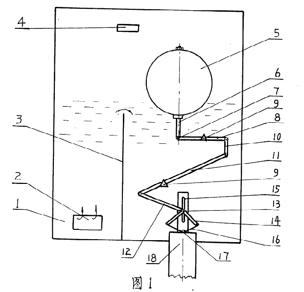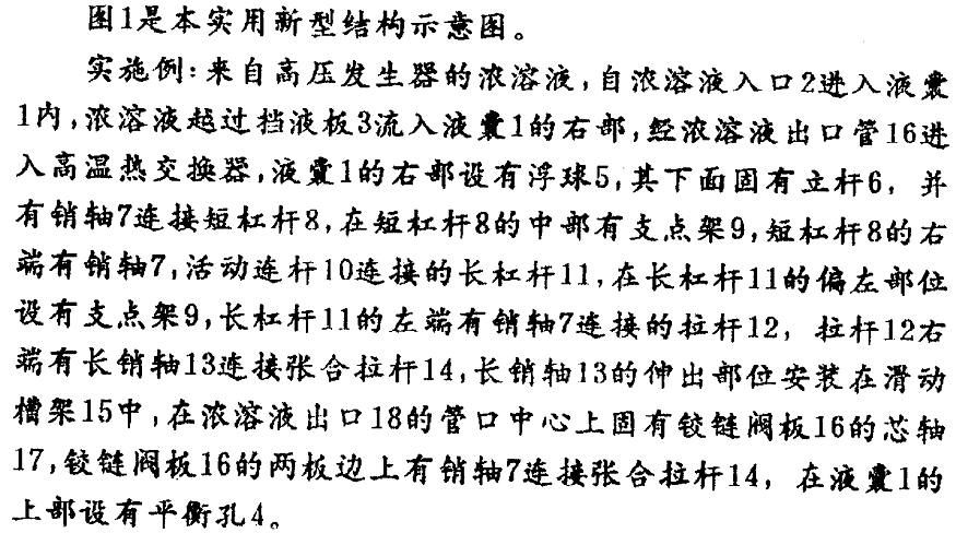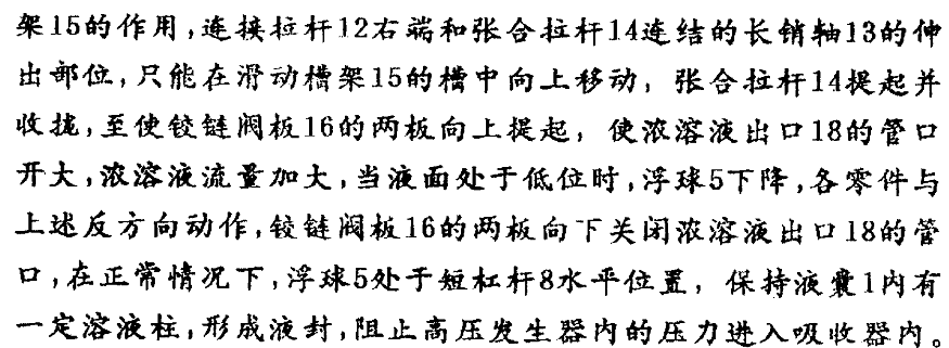 溴化鋰制冷機濃溶液自動節(jié)流裝置,其特征是:在液囊1內(nèi)設有浮球5、立桿6、銷軸7、短杠桿8、支點架9、活動連桿10、長杠桿11、拉桿12、長銷軸13、張合拉桿14、滑動槽架15、鉸鏈閥板16、芯軸17、濃溶液出口18構(gòu)成。本裝置的特點是:利用浮球控制上、下液位,通過多層次連桿、杠桿、拉桿開啟或閉合鉸鏈閥板,調(diào)整濃溶液出口流量,達到自動節(jié)流效果,安全可靠,安裝定位后,不需人工調(diào)試,適用于各種溴化鋰制冷機組。