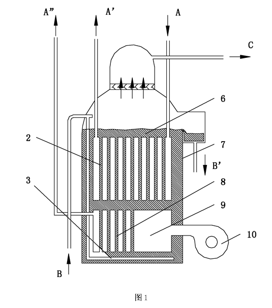 以往的技術(shù)如圖1所示的補(bǔ)燃發(fā)生器,該補(bǔ)燃發(fā)生器是將余熱煙氣傳熱管束2、補(bǔ)燃煙氣傳熱管束8和爐筒9設(shè)置在同一個(gè)筒體7內(nèi),余熱煙氣傳熱管束和補(bǔ)燃煙氣傳熱管束均采用直立水管式結(jié)構(gòu),即煙氣走管外,溶液6及其被加熱時(shí)所產(chǎn)生的蒸汽走管內(nèi)。配置該補(bǔ)燃發(fā)生器的排熱利用型溴化鋰吸收式制冷機(jī)組如圖2所示,該機(jī)組為冷熱水型機(jī)組,可按制冷工況或制熱工況運(yùn)行,提供空調(diào)或工藝用冷水、熱水。機(jī)組的余熱煙氣進(jìn)口管上裝有煙氣電動(dòng)調(diào)節(jié)閥11,用于控制加熱負(fù)荷或切斷加熱煙氣。機(jī)組運(yùn)行時(shí),煙氣電動(dòng)調(diào)節(jié)閥開啟,其開度由機(jī)組的控制系統(tǒng)根據(jù)制冷(熱)負(fù)荷自動(dòng)調(diào)節(jié)控制。機(jī)組停運(yùn)時(shí),煙氣電動(dòng)調(diào)節(jié)閥關(guān)閉。由于結(jié)構(gòu)上的原因,煙氣電動(dòng)調(diào)節(jié)閥關(guān)閉時(shí)難以做到全密封,會(huì)有余熱煙氣漏入補(bǔ)燃發(fā)生器12,加熱其中的溴化鋰溶液,使溶液中的水分不斷蒸發(fā)轉(zhuǎn)移到機(jī)組的低壓發(fā)生器19、冷凝器20等部件內(nèi),導(dǎo)致補(bǔ)燃發(fā)生器中的溴化鋰溶液濃度不斷升高,直至結(jié)晶,從而導(dǎo)致機(jī)組發(fā)生停機(jī)結(jié)晶故障。