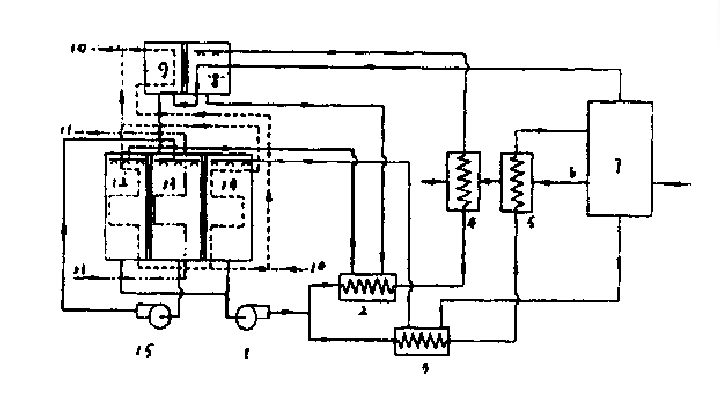蒸汽雙效溴化鋰吸收式制冷機(jī)凝水利用裝置。它是在機(jī)組的低溫?zé)峤粨Q器2后設(shè)置低溫凝水熱交換器4.在高溫?zé)峤粨Q器3后設(shè)置高溫凝水熱交換器5,從溶液泵1出口的稀溶液并聯(lián),一路進(jìn)入低溫?zé)峤粨Q器2、低溫凝水熱交換器4后進(jìn)入低壓發(fā)生器8,一路進(jìn)入高溫?zé)峤粨Q器、高溫凝水熱交換器后進(jìn)入高壓發(fā)生器7;工作蒸汽凝水6出高壓發(fā)生器后依次進(jìn)入高、低溫凝水熱交換器。本裝置能使工作蒸汽凝水余熱更加合理的使用,降低工作蒸汽的耗量,提高整機(jī)的COP值。