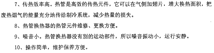 4、運(yùn)行安全。分離式熱管換熱器中若有一組熱管元件損壞,整個(gè)設(shè)備可以照樣繼續(xù)運(yùn)行而不受影響,制冷機(jī)的工作溶液與廢氣也不會(huì)串通。