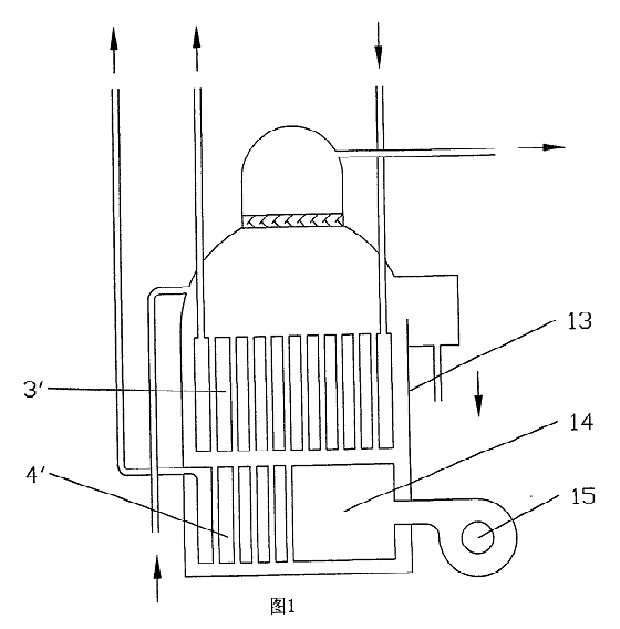 圖中:余熱煙氣換熱管束Ⅰ1、出煙道Ⅰ2、余熱煙氣換熱管束Ⅱ3、出煙道Ⅱ4、余熱煙氣出口連接管Ⅱ5、余熱煙氣出口連接管Ⅰ6、余熱煙氣進(jìn)口連接管Ⅱ7、余熱煙氣進(jìn)口連接管Ⅰ8、補(bǔ)燃排煙連接管9、進(jìn)煙道Ⅱ10、進(jìn)煙道Ⅱ1、補(bǔ)燃煙氣換熱管束12、筒體13、爐筒14、燃燒器15、補(bǔ)燃發(fā)生器l6、高溫?zé)峤粨Q器17、低溫?zé)峤粨Q器18、溶液切換閥19、吸收器20、蒸汽切換閥2l、低壓發(fā)生器22、冷凝器23、蒸發(fā)器24、溶液泵25、冷劑泵26、煙氣熱水換熱器27、熱水進(jìn)口管28、溶液調(diào)節(jié)閥29、熱水出口管30、復(fù)合型低壓發(fā)生器31、余熱煙氣換熱管束3’、補(bǔ)燃煙氣換熱管束4’。