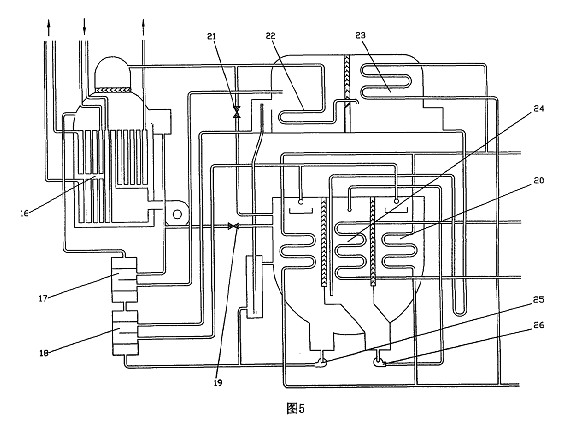 圖5為配置圖4所示雙管束補(bǔ)燃發(fā)生器的煙氣補(bǔ)燃型溴化鋰吸收式冷熱水機(jī)組的結(jié)構(gòu)示意圖。