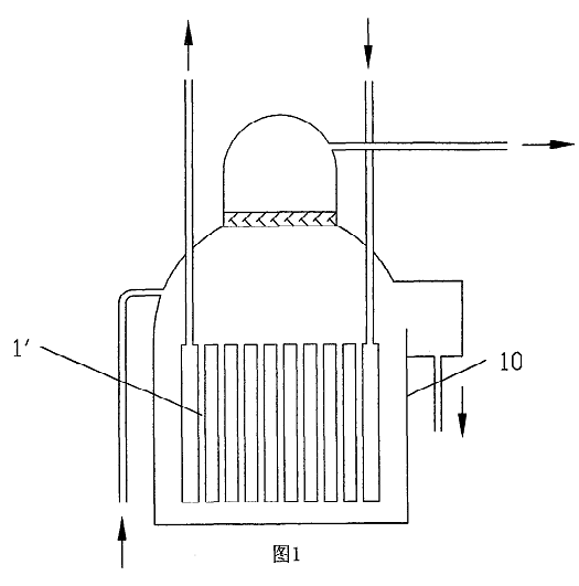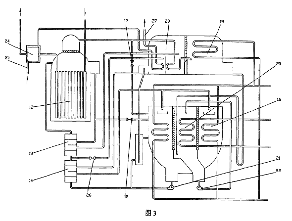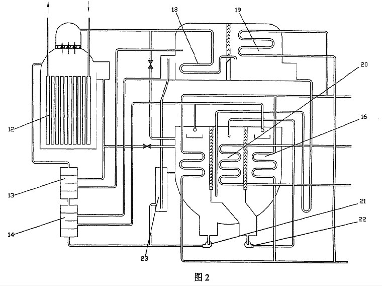 圖中:煙氣換熱管束I1、出煙道Ⅰ2、煙氣換熱管束Ⅱ3、出煙道Ⅱ4、煙氣出口連接管Ⅱ5、煙氣出口連接管Ⅰ6、煙氣進(jìn)口連接管Ⅱ7、煙氣進(jìn)口連接管Ⅰ8、進(jìn)煙道Ⅱ9、筒體10、進(jìn)煙道I11、煙氣型高壓發(fā)生器12、高溫?zé)峤粨Q器13、低溫?zé)峤粨Q器14、溶液切換閥15、吸收器16、蒸汽切換閥17、低壓發(fā)牛器18、冷凝器19、蒸發(fā)器20、溶液泵21、冷劑泵22、自動熔晶管23、煙氣熱水換熱器24、熱水進(jìn)口管25、溶液調(diào)節(jié)閥26、熱水m口管27、復(fù)合型低壓發(fā)牛器28、煙氣換熱管束1’ 。