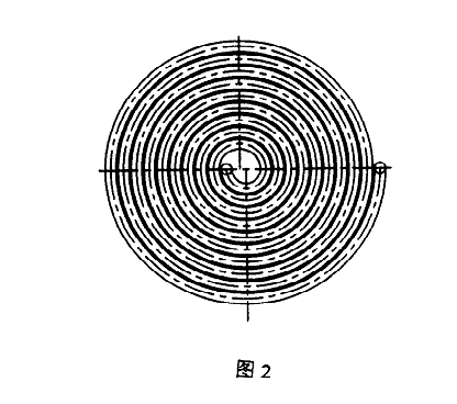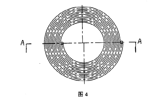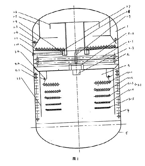 所述的低壓發(fā)生器一冷凝器腔體內(nèi)低壓發(fā)生器l布置在筒體5最上部,冷凝器2布置在低壓發(fā)生器l下方。低壓發(fā)生器l傳熱管1.1采用平面?zhèn)鳠岜P管,由管外圈向內(nèi)圈呈傾斜向下狀盤旋,底部緊貼低壓發(fā)生器1底部殼體。布液管1.2布下的中間溶液在擋板1.3的導(dǎo)流下流向最外側(cè)傳熱管,溶液逐根翻過傳熟管由管內(nèi)高發(fā)冷劑蒸汽加熱濃縮,分離出低壓發(fā)生器冷劑蒸汽,并濃縮成濃溶液,濃溶液翻過擋液板1.8進(jìn)入低發(fā)液囊1.4,由濃溶液出液管1.10導(dǎo)出進(jìn)入制冷機(jī)的低溫?zé)峤粨Q器殼程。分離出的低壓發(fā)生器冷劑蒸汽經(jīng)由擋板1.5、1.6組成的迷宮型擋液通道后氣液分離,冷劑蒸汽由氣道管1.7形成的通道進(jìn)入冷凝器2。低壓發(fā)生器1傳熱盤1.1內(nèi)高發(fā)冷劑蒸汽由管外側(cè)進(jìn)入,加熱管外溶液后被冷凝,形成的凝水從管內(nèi)側(cè)流出,經(jīng)節(jié)流后由凝水節(jié)流管1.9進(jìn)入冷凝器2,冷凝器2底部水盤內(nèi)正對著凝水節(jié)流管1.9設(shè)置防沖板2.2。冷凝器2傳熱管2.1采用水平盤管。冷凝器2傳熱管2.1管內(nèi)冷卻水冷凝來自低壓發(fā)生器的冷劑蒸汽及經(jīng)凝水節(jié)流管1.9的來自高發(fā)的冷劑蒸汽凝水,使低壓發(fā)生器冷劑蒸汽降溫后冷凝和高發(fā)冷劑蒸汽凝水降溫后共同進(jìn)入冷凝器水盤,由冷劑水盒2.3匯集后,經(jīng)小孔節(jié)流后經(jīng)U型管進(jìn)入蒸發(fā)器3。