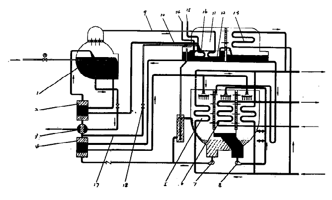 多能源烈效型溴化鋰吸收式制冷機,包括高壓發(fā)生器(1)、低壓發(fā)生器(11)、蒸發(fā)器(6)、吸收器(5)、冷凝器(13)、高溫?zé)峤粨Q器(2)、低溫?zé)峤粨Q器(4)、溶液泵(7)、冷劑泵(8)、及連接各部件的管路、閥,其特征在于所述的低壓發(fā)牛器(11)是復(fù)合型低壓發(fā)生器,存低溫?zé)峤粨Q器(4)稀溶液管路引一路(17)直接進入復(fù)合型低壓發(fā)生器(11),管路(17)上加裝調(diào)節(jié)閥(18)。木實用新型通過同時設(shè)置直燃高壓發(fā)生器和復(fù)合型低壓發(fā)生器,使機組能同時或分別利用熱水或直接燃燒燃料產(chǎn)生的熱量驅(qū)動運行。