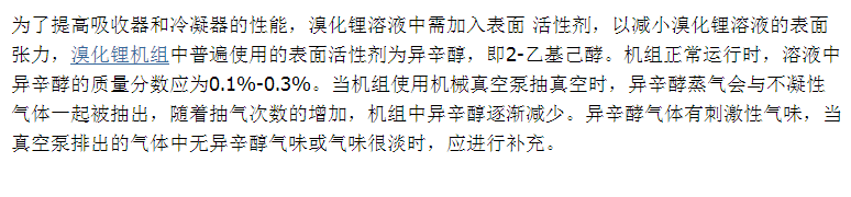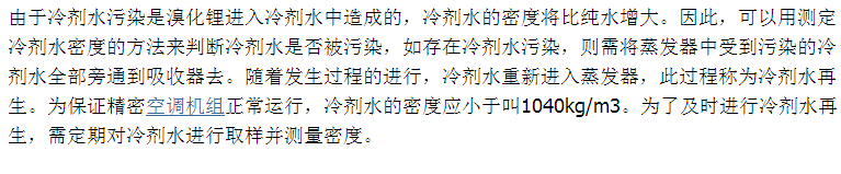 溴化鋰吸收式制冷機(jī)組(冷熱水機(jī)組)所用的制冷劑是水,通常稱為冷劑水,在機(jī)組運(yùn)行時(shí),或多或少會(huì)有少量溴化鋰進(jìn)入蒸發(fā)器的冷劑水中,由于溴化鋰不會(huì)蒸發(fā),而冷劑水在不斷發(fā),溴化鋰將在蒸發(fā)器中積累下來,這種現(xiàn)象稱為冷劑水污染。發(fā)生冷劑水污染時(shí),機(jī)組性能下降、制冷量不足。
