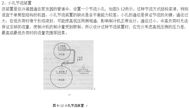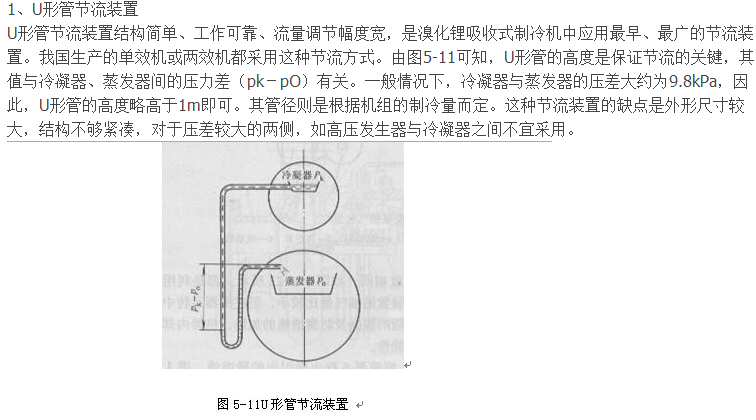 節(jié)流裝置是一個重要部件。它有多種型式??梢允轻槧罟?jié)流閥,浮球閥、U形管或小孔節(jié)流元件。溴化鋰吸收式制冷機中最常用的是U形管和小孔節(jié)流元件。