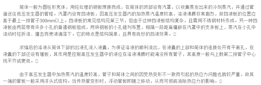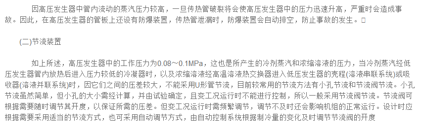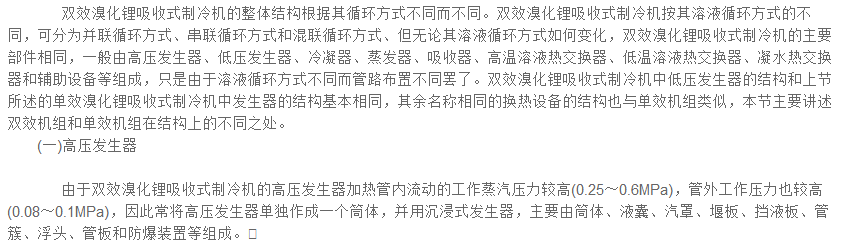 如果機組制冷量較大,則下筒體就顯得笨重,運輸和安裝都不方便,這時一般把下筒體再分成兩個部分,即把低壓發(fā)生器和冷凝器單獨設置在一個筒體中,把蒸發(fā)器和吸收器設置在另一個筒體中。這時常把高壓發(fā)生器筒體和低發(fā)----冷凝筒體并列安放在蒸發(fā)----吸收筒體的上部、即構(gòu)成三筒型溴化鋰吸收式制冷機。目前國內(nèi)的雙效溴化鋰吸收式制冷機制冷量在1750kW(150×104kcal/h)以上的一般為三筒型,制冷量在600kW(50×104kcal/h)以下的一般為雙筒型,600~1750kW之間的機組可根據(jù)需要靈活選用。