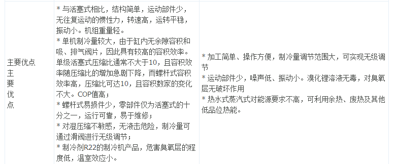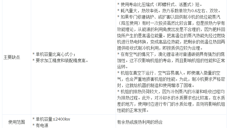 對溴化鋰吸收式制冷機與其它制冷機進行比較研究,認為:在一些特定場合(如高溫環(huán)境)大型集中式中央空調(diào)設計中,選用溴化鋰吸收式機組是利大于弊的;而在現(xiàn)有的條件下:電力取消電力增容費、螺桿式壓縮機CNC加工技術的提高、螺桿機能量調(diào)節(jié)技術的成熟及配備先進的自動化控制技術等,其螺桿式機組的優(yōu)越性顯現(xiàn)出來,其螺桿式機組逐步在取代溴化鋰吸收式制冷機,從一些溴化鋰吸收式制冷機生產(chǎn)廠家逐步在開發(fā)、推廣螺桿式機組的實際情況可以得到說明。下面將從如下方面加以說明: