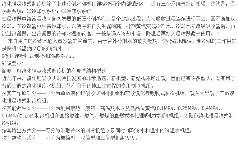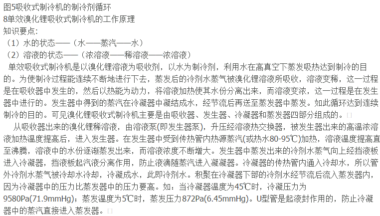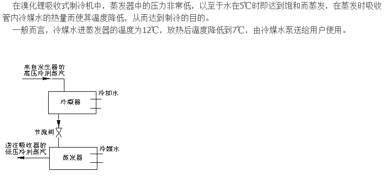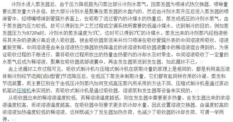 溴化鋰吸收式制冷機(jī)中的制冷劑就是水。水在制冷循環(huán)中狀態(tài)不斷改變,并利用其在蒸發(fā)時的吸熱而產(chǎn)生制冷的。