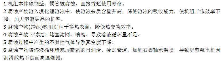 溴化鋰機(jī)組在使用過程中由于緩蝕劑不斷的消耗其含量逐漸不足,再加上機(jī)組氣密性不佳時(shí)氧氣的侵入,造成溴化鋰溶液的腐蝕性增強(qiáng),加上銅(Cu2+)鐵(Fe3+)離子的相互(電位差)腐蝕,機(jī)組經(jīng)常出現(xiàn)一下問題: