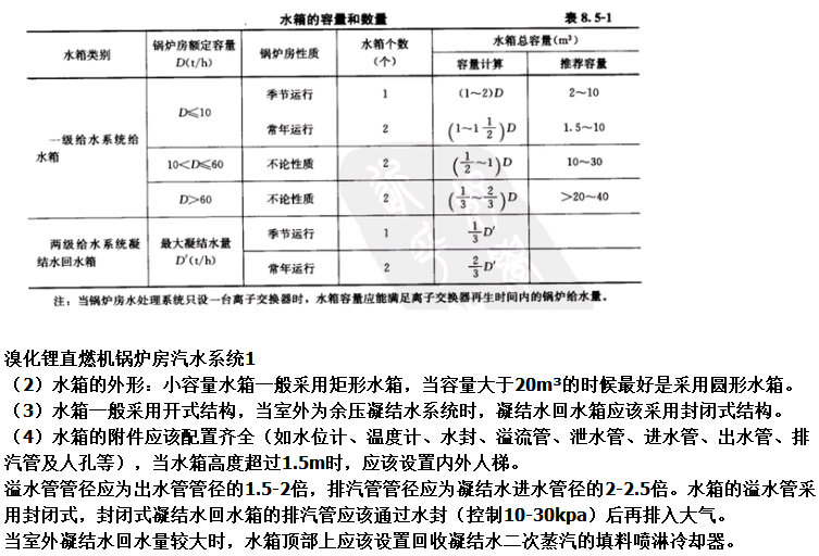 在溴化鋰直燃機鍋爐房內(nèi)除了采用除氧設(shè)施需設(shè)置除氧水箱采用的兩級給水系統(tǒng)外,一般可采用水箱和凝結(jié)水回水箱用的一級給水系統(tǒng)。