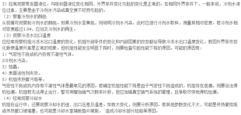 2)經(jīng)常觀察吸收器液位。引起吸收器液位變化的原因主要有:①機組真空度下降;②冷劑水污染:③溶液循環(huán)量調(diào)節(jié)不當(dāng)?shù)取.?dāng)外界條件發(fā)生變化時也會引起液位的變化,這屬于正常的變化。在運行中發(fā)現(xiàn)吸收器液位出現(xiàn)異常變化時,應(yīng)及時進行溶液取樣分析,認真解決。