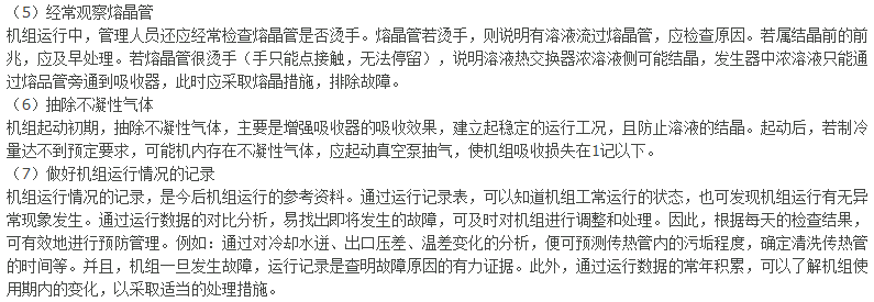 在機組運行中應(yīng)對發(fā)生器、吸收器及蒸發(fā)器的液位勤加觀察,即使是全自動控制的機組,也應(yīng)如此。