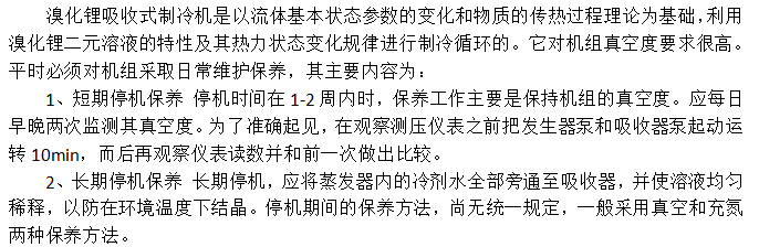????溴化鋰吸收式制冷機(jī)是以流體基本狀態(tài)參數(shù)的變化和物質(zhì)的傳熱過程理論為基礎(chǔ),利用溴化鋰二元溶液的特性及其熱力狀態(tài)變化規(guī)律進(jìn)行制冷循環(huán)的。它對(duì)機(jī)組真空度要求很高。平時(shí)必須對(duì)機(jī)組采取日常維護(hù)保養(yǎng),其主要內(nèi)容為: